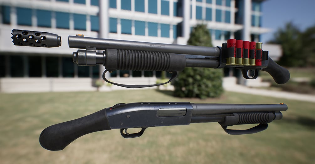 This is a first person weapon model of a Mossberg 500 shotgun, with a short grip, shell rack, and breach compensator. Note that the ammo in the screenshot is NOT included, but is available as another download on Gumroad.